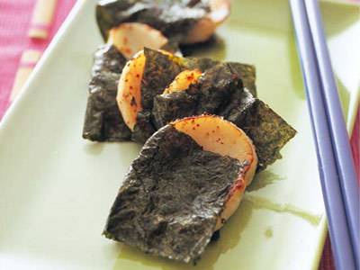 焼きたての帆立て貝柱に七味とうがらしをふり、焼きのりで包む。