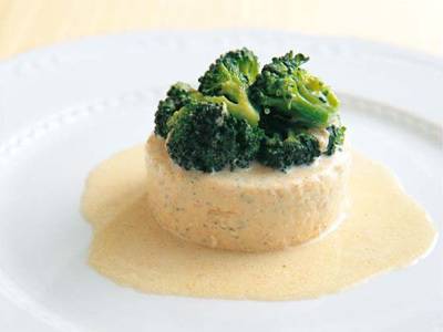 3のムースに竹ぐしを刺してみて、なにもついてこなかったら、蒸し上がり。ムースをココット型から器にあける。塩少々を入れた熱湯でゆでたブロッコリに塩少々をふって添え、【豆乳ソース】をかける。