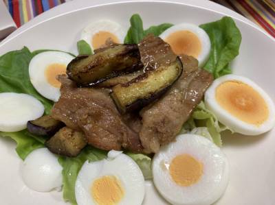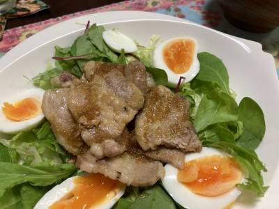 たれを回し入れ、フライパンを軽く揺すって味をなじませる。火を止めて、豚肉を3の器の真ん中に盛り、焼き汁をかける。