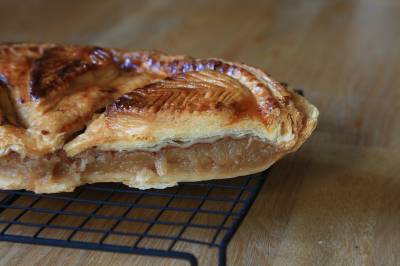 飾りの葉と葉の間に、ナイフで約8cm長さの切り込みを、りんごに当たるまで深く入れる。生地の中心部にも空気が抜けるよう、×印の切り込みを入れ、竹ぐしで全体に穴をあける。200℃のオーブンで20分間焼き、さらに190℃に下げて約40分間きつね色になるまで焼く。焼き上がったら、パイ皿から出して金網などの上に置き、粗熱を取る。
