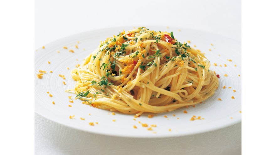 にんにく、オリーブ油、赤とうがらしのシンプルパスタ。オリーブ油ににんにくのうまみと香りをしっかりと移すことがコツで、パスタの基本です。