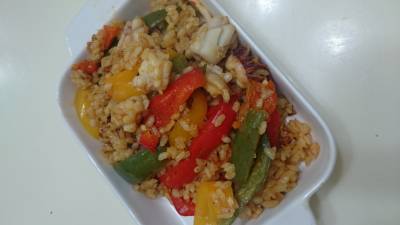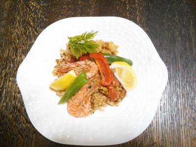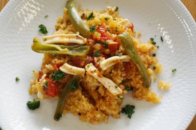 サフランを使わないパエリア。オレンジジュースとカレー粉で色をつけて。