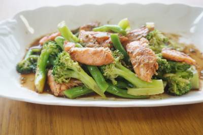 焼いたさけと野菜をあわせたボリューム満点おかずサラダ。バルサミコ酢と粒マスタードがご飯に合います。