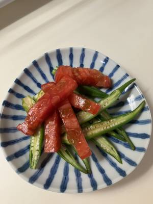 オクラは塩少々をふってもみ、うぶ毛を取る。塩少々を入れた湯でサッとゆでて冷水にとり、水けをきって縦半分に切る。