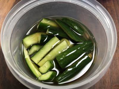 きゅうりは半分の長さに切って縦半分に切る。種をスプーンなどでそぎ取り、保存容器に入れて、混ぜ合わせた【A】を注ぎ、3時間以上おけばでき上がり。冷蔵庫で約1週間保存可能。