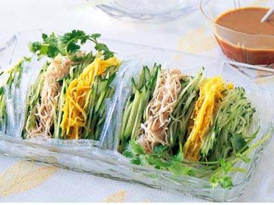 卵はサラダ油少々をひいたフライパンで薄焼きにし、細切りにする。