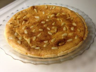 松の実をまんべんなく散らし、180℃に予熱したオーブンで約20分間焼く。表面が色づいてきたら、中央に直径約12cmの穴をあけたアルミ箔をかぶせて、さらに10分間焼く。