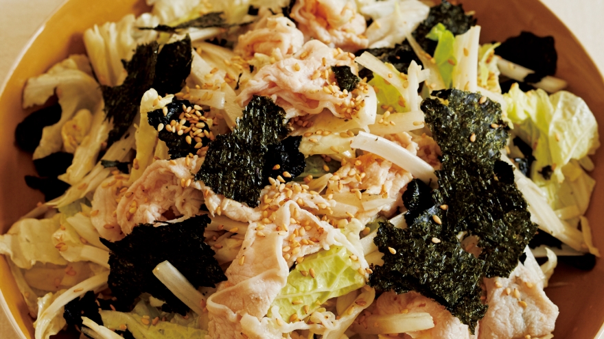 冬のみずみずしい白菜を、韓国のチョレギサラダ風の味つけでたっぷりいただきます。低温でゆでた豚肉は、しっとり、柔らかです。