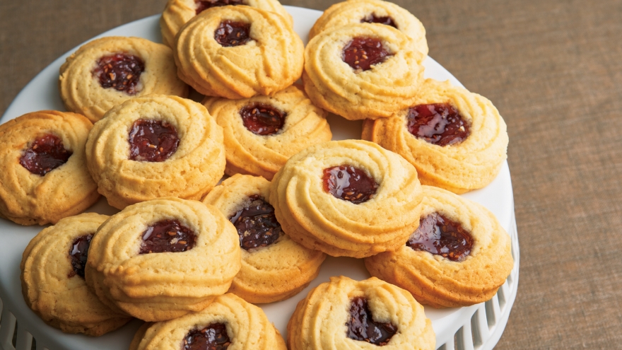 真ん中にジャムをのせて焼き上げた、どこか懐かしいクッキー。焼きたてをほおばると、外はカリッ、中はふんわり!冷めてもおいしいので、お客さまへのおみやげにも。