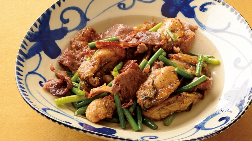 5のフライパンをサッと拭き、サラダ油大さじ1を足して牛肉を入れ、かきと同様にあまり動かさず中火で焼き色をつける。塩少量を加え、4のにんにくの芽、5のかきを戻し入れてサッと混ぜ、【合わせ調味料】を加えて照りよく炒め合わせ、黒こしょう適量をふる。