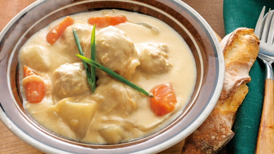 しょうがをきかせたボリューム満点のクリームシチューです。やさしく、食べやすい味で、ふわふわのチキンボールがポイント。