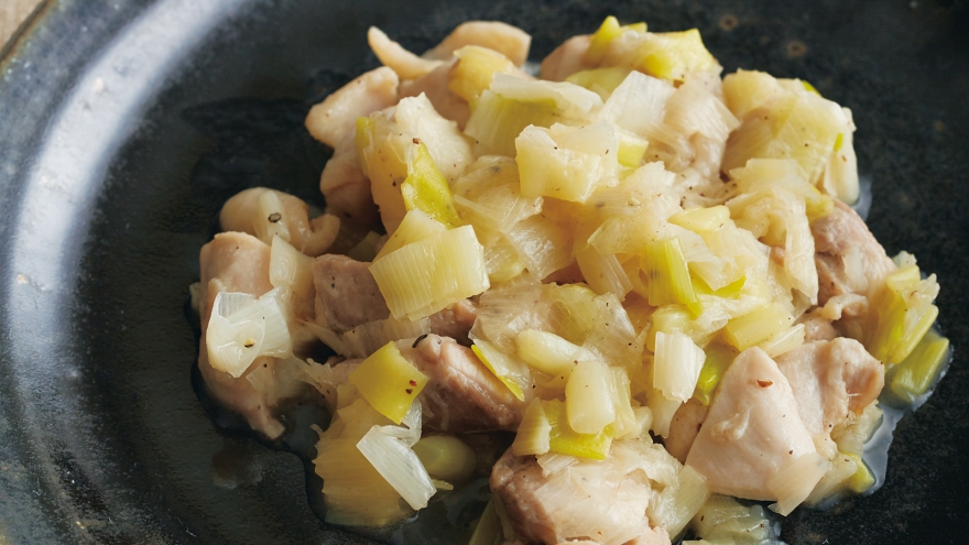 鶏もも肉は余分な脂を取り除いて2cm角に切り、1に加えて炒め、表面が白っぽくなったらふたをして弱火で約3分間蒸し焼きにする。