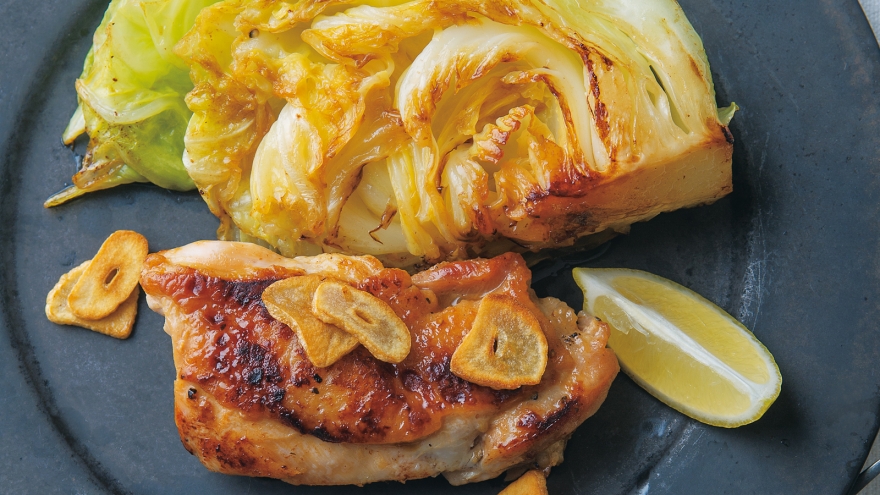 こんがりと焼けた春キャベツが、主役。大胆に大きなくし形に切り、鶏肉のうまみを吸わせつつ、甘みを引き出し蒸し焼きに。