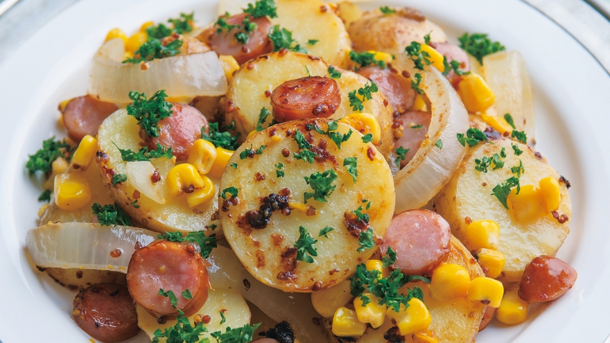 フライパンにじゃがいもを重ならないように並べ、【A】をよく混ぜて回しかける。たまねぎ、ソーセージ、コーンを広げて重ね、水をふり、ふたをして中火で8分間ほど蒸し焼きにする。