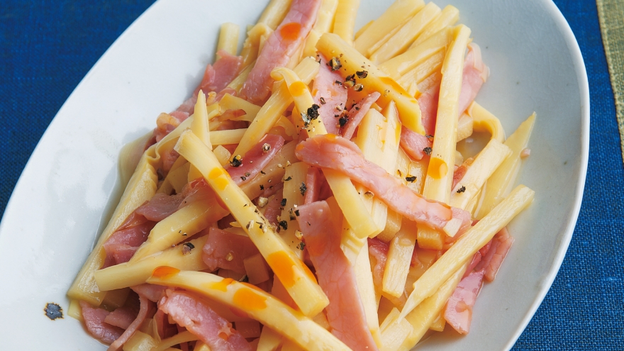 たけのこは5㎝長さの細切りにする。ハムは細切りにする。【A】は混ぜ合わせておく。
