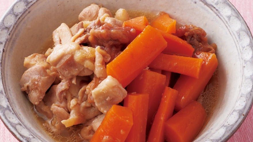 鍋にサラダ油を入れて中火にかけ、1の鶏肉を加えて炒める。焼き色がついたら春にんじんの梅煮を加え、アクを取りながら10分間ほど煮る。