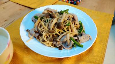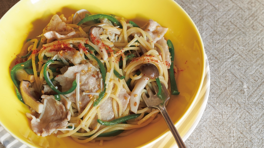 きのこと豚肉のごまみそだれパスタ
