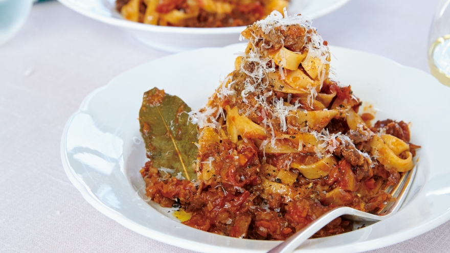 肉全体の色が変わったら、赤ワインを加える。木べらで肉をほぐしてワインとなじませながら、煮汁が半量になるまで4~5分間、中火で煮詰める。