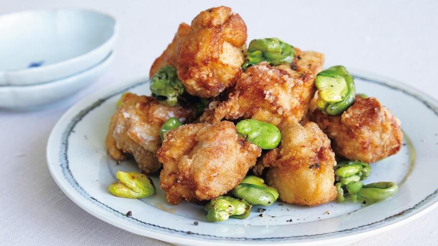 そら豆は薄皮に切り目を入れ、170℃に熱した揚げ油に入れる。1分間ほど素揚げして網に取り出し、油をきる。