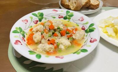 鶏肉は一口大に切るよりも薄切りにしたものを丸めて握ったほうが、スープで煮ても堅くならず、しっとりと仕上がる。