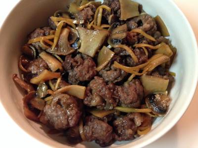 鍋にだし、2を汁も一緒に入れて中火にかけ、煮立ったら火を少し弱め、2~3分間煮て1のしょうがと【A】を加える。再び煮立ったら一口大程度に丸めながら牛肉を加え、火を少し強める。焦げつかないように注意をしながら、煮汁がほぼなくなるまで煮て、火を止める。