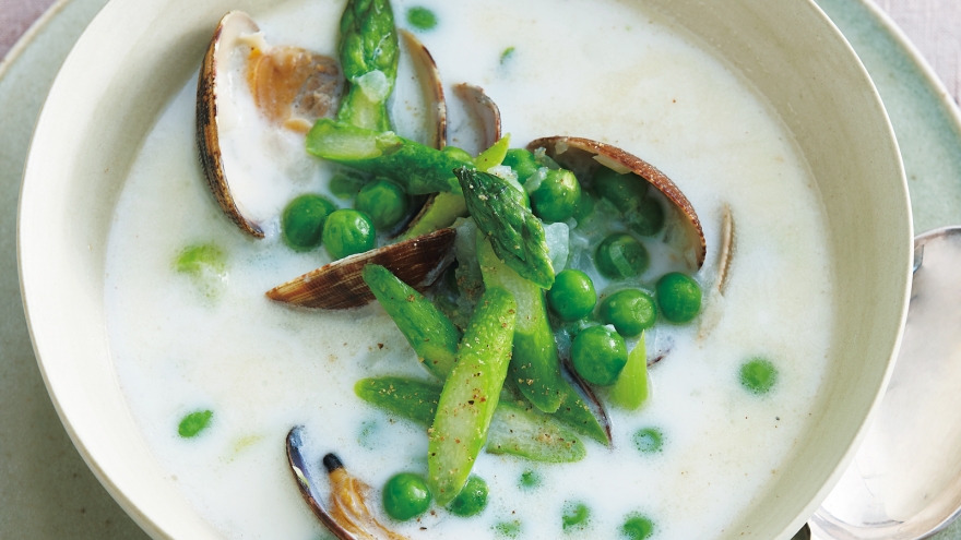 あさりのふうみと新たまねぎの甘みを生かしたさっぱりしたミルクスープです。グリンピースとアスパラの鮮やかな緑が目にもうれしい一皿に。