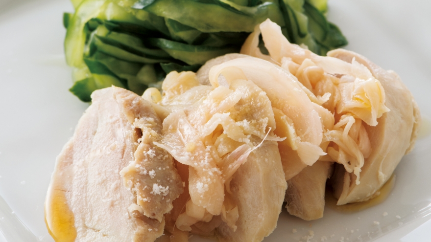 蒸気の上がった蒸し器に入れ、強火で15分間蒸し、ラップをしたまま粗熱を取る。一口大のそぎ切りにし、新しょうがのうす塩漬けと一緒に器に盛りつけ、1を添える。鶏肉にごま油を回しかけ、塩少々をふる。