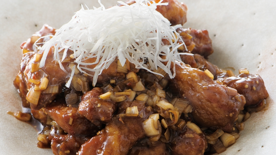 肉のうまみが楽しめるシンプルなメニュー。黒酢漬けのらっきょうがアクセントに。