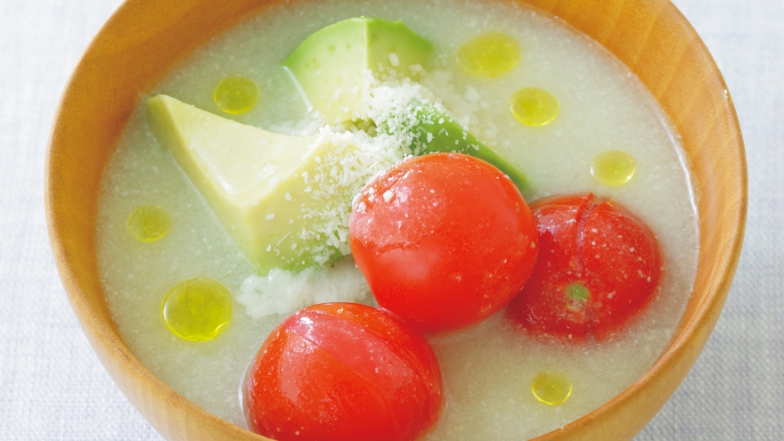 アボカドを半量ずつ椀(わん)に入れ、3を注ぐ。最後にパルメザンチーズをふり、オリーブ油を加える。
