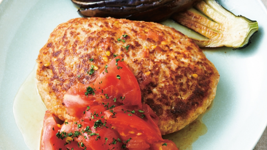 豆腐をたっぷり混ぜ込んだフワフワの特大ハンバーグです。豆腐の水けはしっかり絞り、パン粉にも水分を吸ってもらうのがポイント。みずみずしいトマトのソースでさっぱりいただきます。