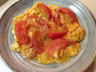 フライパンにバター、サラダ油を強火で熱し、トマトをサッと炒める。油が回ったら3を流し入れ、へらを左右に大きく、静かに動かしながら火を通す。