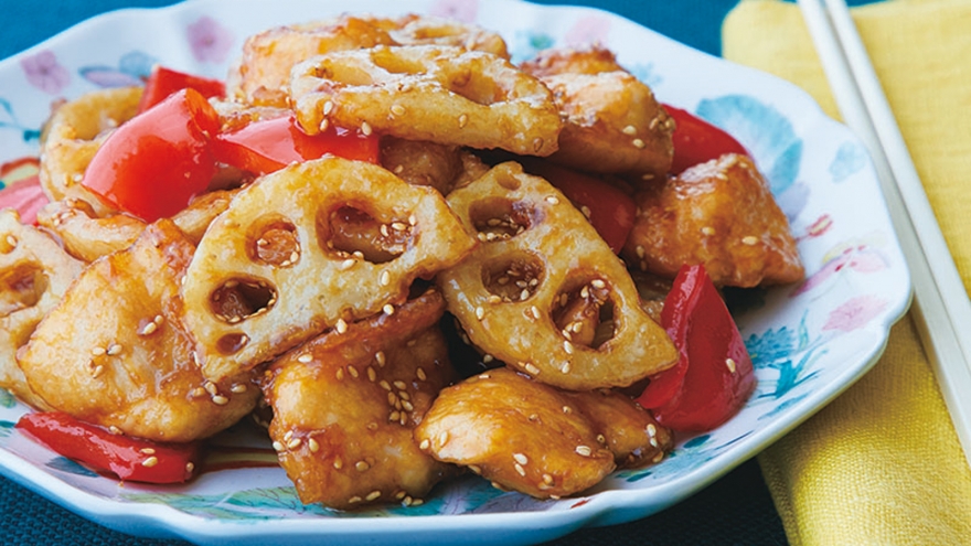 デリカテッセンでも大人気!中国風の甘酸っぱいあんをまとった、お惣菜風おかずです。れんこんの食感がおいしさのポイント。鶏肉と一緒に揚げたときに、ちょうどいい火の通り方となるように、大きさはそろえて。