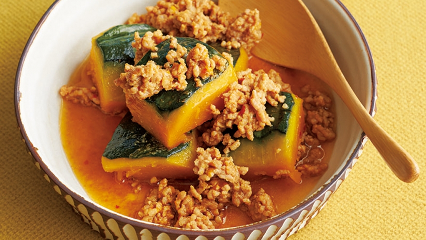 豚ひき肉に豆板醤を加えて、ピリッとアクセントのあるボリュームおかずに。底が広いフライパンで煮れば、煮くずれしやすいかぼちゃも形を保ってきれいに仕上がります。