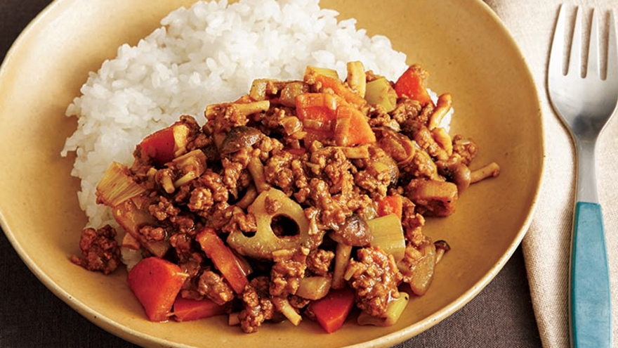 冬は根菜がおいしい季節。合いびき肉とスパイシーなドライカレーに、れんこんの食感がアクセント。
