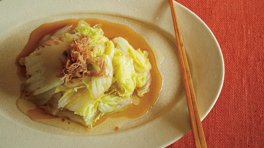 柔らかく蒸した白菜を、エスニック風のたれとしょうがの香りがきいたオイルでいただきます。