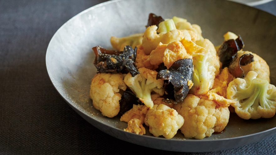 きくらげはたっぷりの水に10分間つけて戻し、石づきを除いて半分に切る。カリフラワーは小房に分け、大きいものは半分に切る。にんにくは薄切りにする。