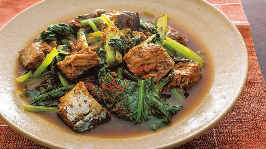 アクの少ない小松菜は、下ゆでなしでシャキッと炒め煮に。缶詰のさばのみそ煮と合わせれば味つけも簡単です。青背の魚の栄養も余さずとれる、健康的なおかずです。