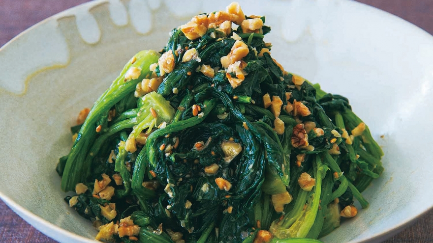 霜に当たったほうれんそうの甘みや柔らかさがしみじみと感じられる、みそを使ったナムルです。体を温めるといわれるくるみで、さらにコクを出して。