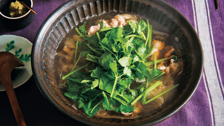 豚肉の色が変わったところで、気になるようならアクを取り除き、せり適量を加えてサッと火を通す。器に取り分け、好みで柚子、七味とうがらしや柚子こしょう、粉ざんしょうを添える。