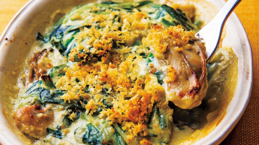 かきのうまみが詰まったソースは、ほうれんそうにふりかけた小麦粉でとろみづけ。少しだけ入れたカレー粉が、かき独特の香りをやわらげます。
