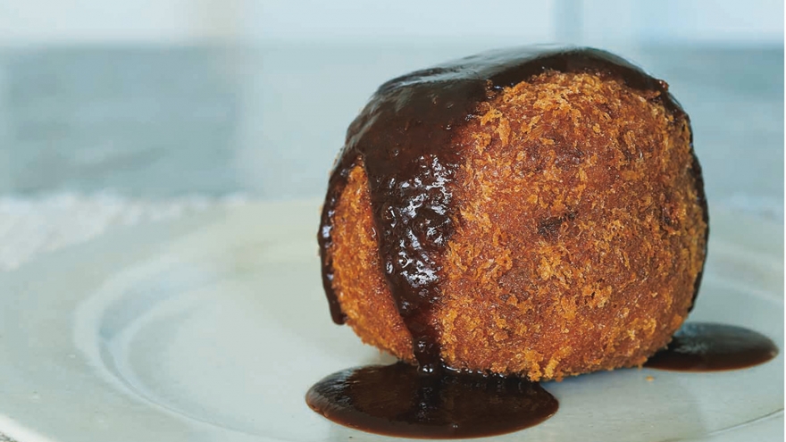 2を2~3等分にし、手のひらに打ちつけるようにして中の空気を抜き、丸く形づくる。小麦粉、溶き卵、生パン粉の順に【衣】をつけ、さらにもう一度、溶き卵にくぐらせて生パン粉をつける。