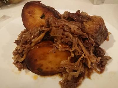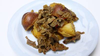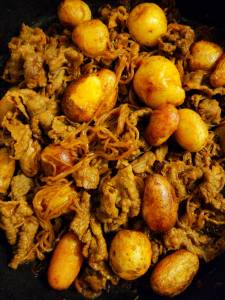 じゃがいもの皮がカリッと香ばしく焼けてから、肉を加える。