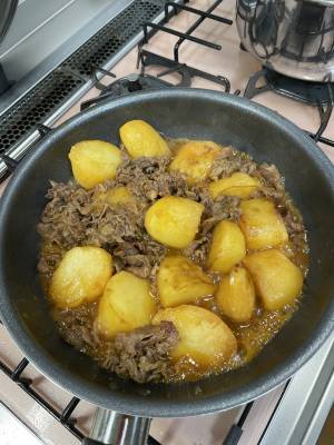 肉の色がだいたい変わったら2の【煮汁】を注ぎ、そのまま中火で汁けをとばしながら煮る。4~5分間たったらじゃがいもの上下を返し、合計で8~10分間ほど煮る。
