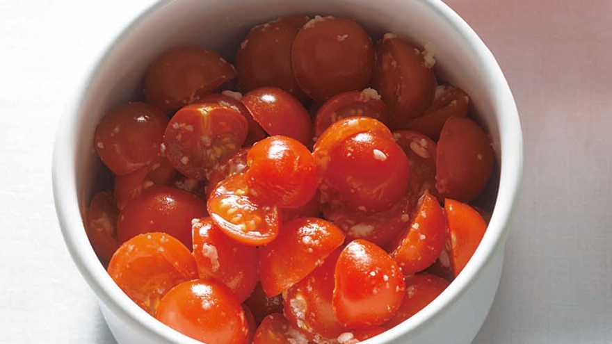 ミニトマトに塩こうじを合わせるだけで、うまみたっぷりの常備菜に。炒め物にも便利!