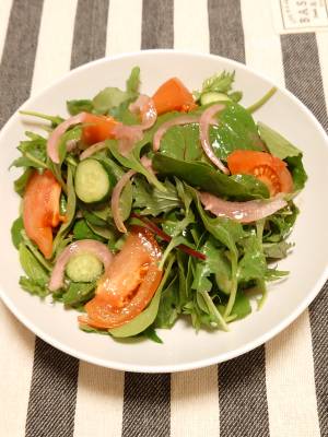 器にベビーリーフ、1を入れ、紫たまねぎの酢漬けと漬け汁を加え、【A】をかけてあえる。
