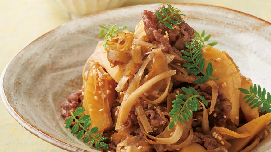 コリコリのたけのこ、シャキッとしたピーラーごぼう、柔らかい牛肉。3つの異なる食感が楽しいおかずです。