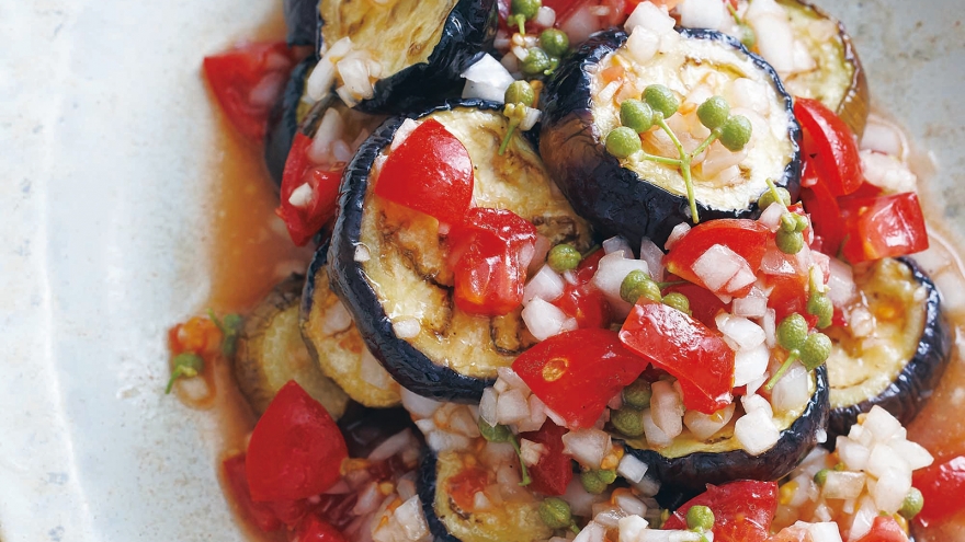 なすは1cm厚さの輪切りにし、塩少々をふって7~8分間おき、水けを拭く。耐熱皿に並べてオーブントースターで7~8分間焼く。ミニトマトは1cm角に切る。