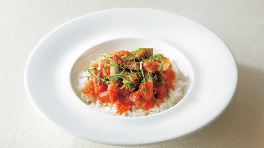 「ぼっかけ」とは、牛すじ肉とこんにゃくを甘辛く煮た、神戸市長田区生まれの料理のことです。すじ肉のかわりに切り落とし肉を使い、さらにトマトのうまみが加わって、爽やかなどんぶりになりました。