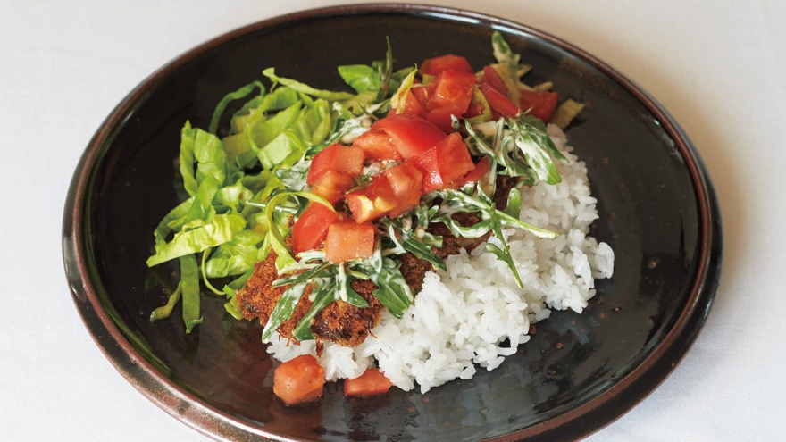ボウルにちぎったセルバチコとマヨネーズを入れて軽くあえる。皿にご飯を盛ってレタスを添える。ご飯の上にカツレツ、セルバチコ、トマトを順にのせる。