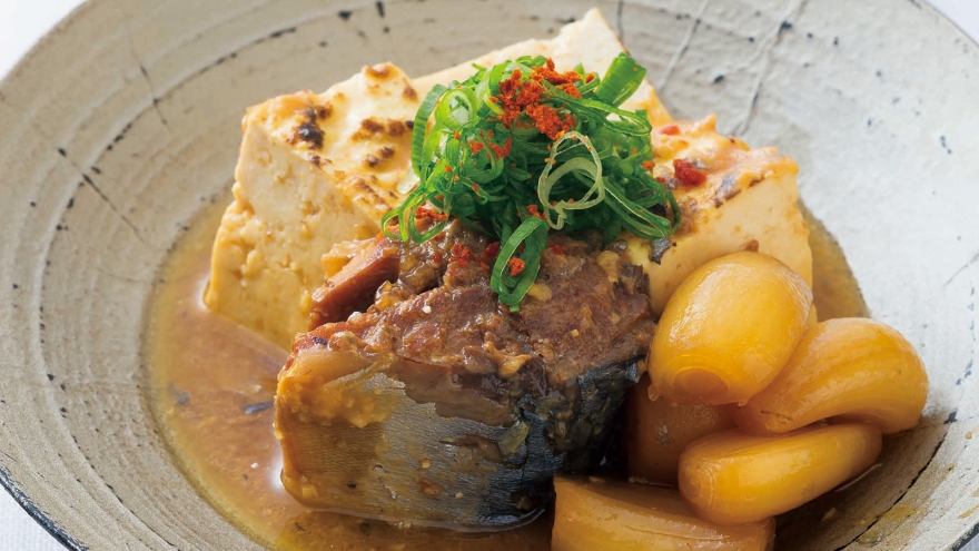 焼き豆腐は8等分に切る。鍋に入れ、さばのしょうゆ煮、らっきょうもみそごと加えてふたをし、弱火で5~6分間煮る。